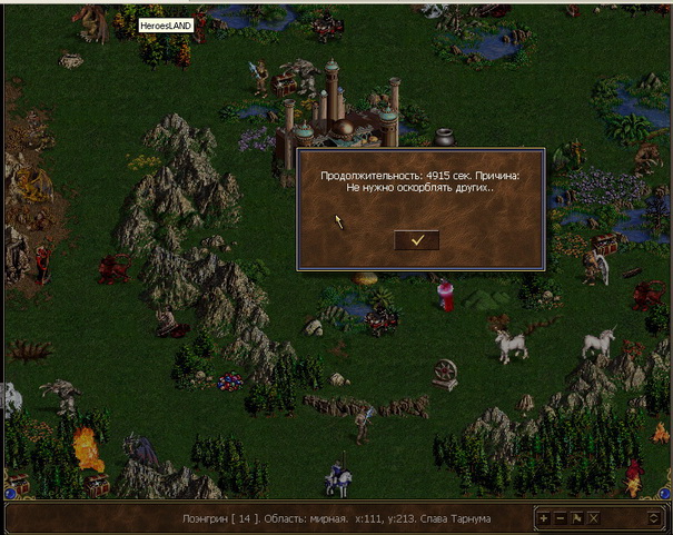 Посмотрите вот здесь http://forum.heroesland.com/viewtopic.php?f=15&t=2842 Кусок чата вырван из общей темы и за это меня наказали. Причем к игроку лично я не обращался. Так можно любого в бан отправить, по ложному навету. Если будут вырывать куски чата и сами додумывать к кому и зачем это относилось...