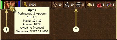 Зеленая полоска слева от портрета героя визуально показывает состояние армии героя – если полоса не полная, то еще не все войско готово к следующей битве. Синяя полоска справа от портрета героя – состояние маны.