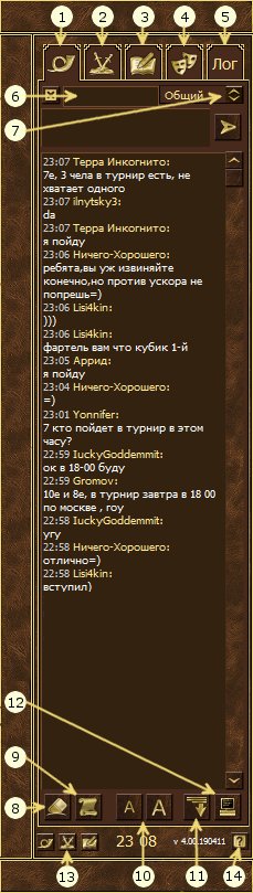 1 – вкладка чата. Общение игроков в игре происходит через чат. При нажатии на кнопку 7 можно указать тип чата – общий, торговый, клан-чат. Они служат разным целям и отображаются разными цветами для более удобной идентификации. Также существует приватное общение – для этого в строку 6 необходимо вставить имя того героя, которому вы хотите что-то написать.