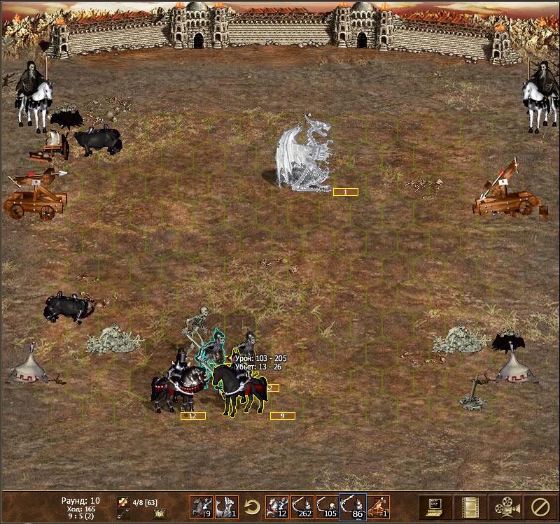 Интересующий меня момент на ходу 165, раунд 10. Контрафорс здесь однозначно побеждает, у Рамука остался один стэк - 63 замедленных апскелета, у Контрафорса 262 апскелета, 105 скелетов, 12 апконей, 9 коней и 1 пд. У него в книге есть ещё минимум 1 стрелка и 1 цепная, но он не кастует, хотя цепная, если бы прошла, сразу же бы закончила бой в его пользу. Он может ударить ожидающими драконами, чтобы попытаться состарить, и улететь обратно, ведь ответка уже снята, но он этого не делает. У Контрафорса легенда, поэтому каждый его удар может испугать противника, то есть вообще лишить действий Рамука в раунде. И даже если будет резист, а старение и испуг не пройдут, оставшиеся стэки Контрафорса суммарно убивают 71-166 скелетов, то есть даже при выпадении самого минимального урона добивают стэк. Но вместо этого Контрафорс отводит войска и даёт отресаться, хотя чтобы победить сразу, ему нужно просто продолжить делать то, что он делал предыдущие раунды. Для меня это показалось нелепицей, ведь Рамуку победу уже не отдать, но потом мне объяснили, что таким образом можно набить больше опыта, чтобы получить больше очков, чтобы при равном количестве побед в ПсР старшая медаль ушла тебе. Поэтому я бы и хотел узнать на будущее, разрешено ли не добивать противника, чтобы он отресался побольше, и получить с него больше очков?