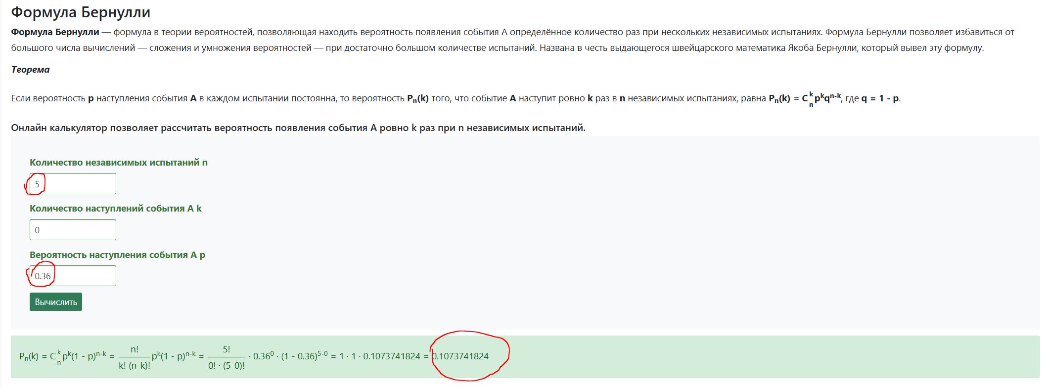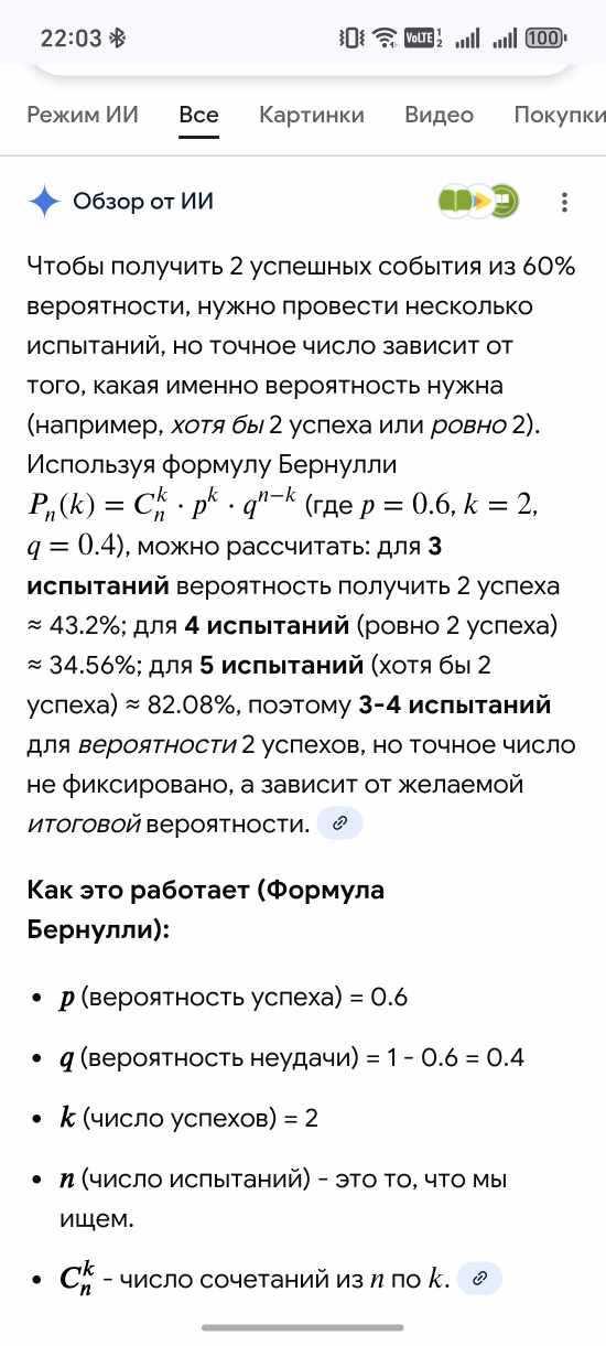 Красивая формула.. И имя громкое.. Авторитетище!.. Но : Разве ты не заметил, что она лишь предсказывает вероятность того, что в серии испытаний при заданной вероятности единичного события - случится нечто ожидаемое ? Она никак и ничем, не намекает даже на то, что какое-то количество проб "обязанны" быть удачными, как ты того требуешь. Ответ по теме от ИИ - нужно ещё и понимать правильно :mrgreen: