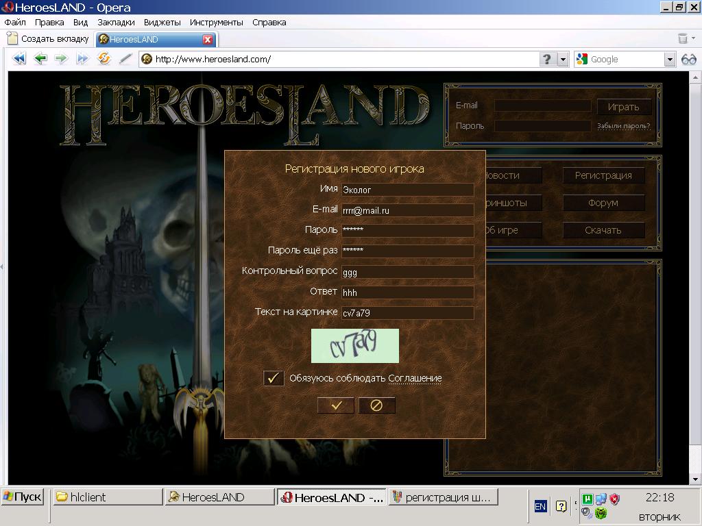 Проверил специально - зарегистрировался успешно. Что именно у вас не работает? Какой браузер используете?Эколог писал(а):1. не работает регистрация на сайте игры.