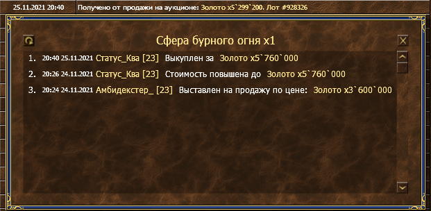 Герой Амбидекстер_, фракция Хорошие, выставил доповую сферу огня на аук. Лот был выкуплен по цене 5,760,000. Герою Амбидекстер_ дошло только 5,299,200, или 92% от стоимости лота, вместо 94.5% стоимости. На момент выставления лота и на момент покупки лота бонус от великой охоты был у фракции Хороших.