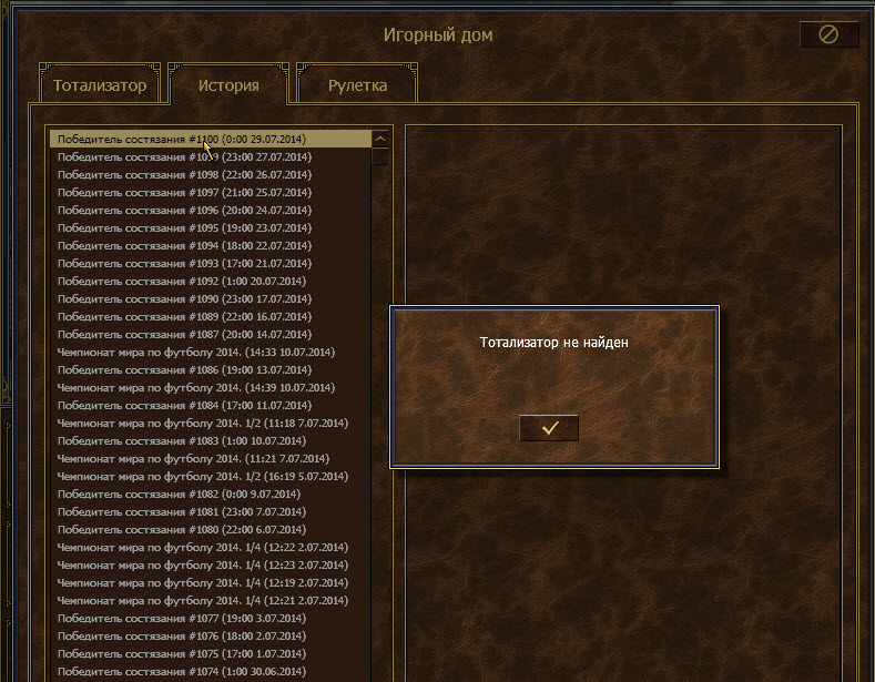 Если открыть историю состязания №1100 в игорном доме пишет тотализатор не найден.