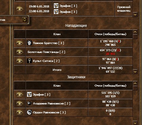 Смотрите. Мы же не хотим, чтобы исход осады решался в двух, трёх или даже пяти битвах, верно? Это доложен быть комплекс мероприятий проводимых задолго до осады, перед самой осадой и непосредственно на осаде. И всё это должно грамотно управляться: кого звать на помощь, как помочь/помешать участникам добраться к Крепости, где, кем и в какое время вставать на атаку/защиту и т.п.Pro_XBOCT писал(а):Док, поделитесь Вашими рассуждениями в этом ключе, пока математика не сходится.phdoc писал(а):Спасибо.alagar писал(а):со стороны ОР-Эрафия