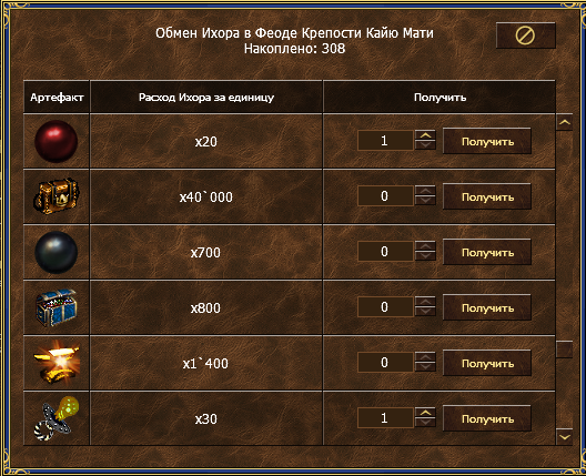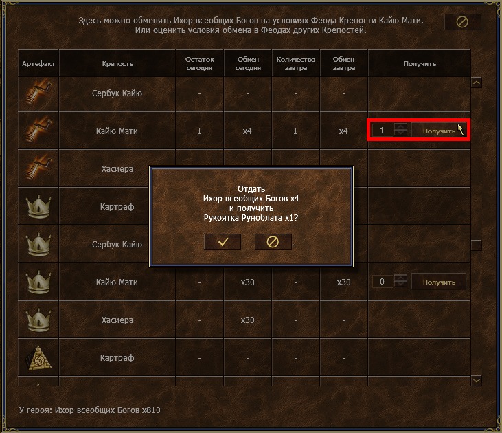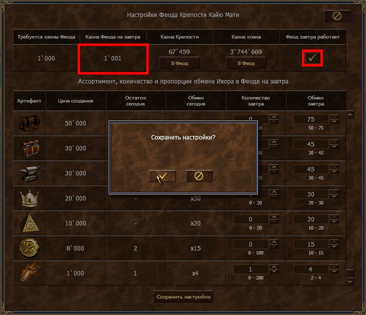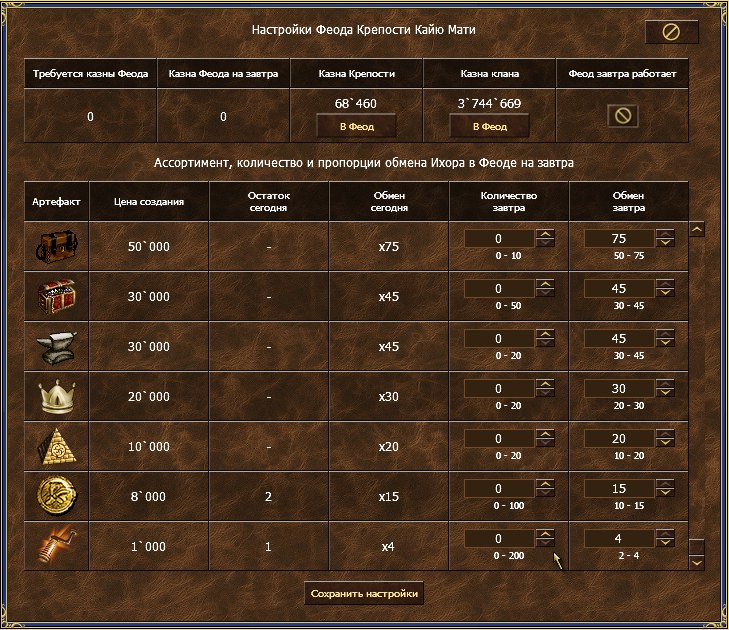 Обменять ихор на товары можно будет после 21:00 мск, иногда чуть раньше. Все излишки, перенесённые в казну феода сверх необходимого для создания предметов на обмен, вернутся в полном размере в конце следующего дня в казну крепости. Аналогично все нераскупленные предметы переконвертируются обратно в золото по 100%-му курсу (указанному в колонке "Цена создания") и вернутся в казну крепости. Настройки придётся выставлять каждый день, они не сохраняются.
