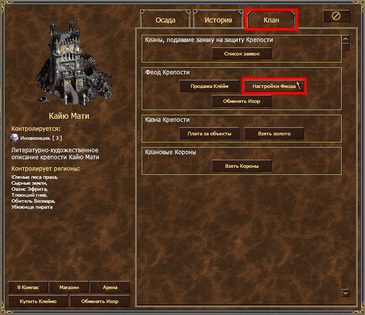 Теперь необходимо включить феод. Для этого нужно зайти в крепость и на вкладке "Клан" в разделе "Феод крепости" нажать "Настройка Феода". Чтобы можно было включить феод, сначала нужно выставить предметы на обмен, указав количество и их цену в ихоре. Если ни одного предмета не выставлено, феод включить не удастся. В колонке "Цена создания" написано, сколько нужно золота перенести из казны крепости или казны клана в феод, чтобы создать 1 соответствующий предмет. Суммарная стоимость всех выставленных предметов будет в поле "Требуется казны феода".