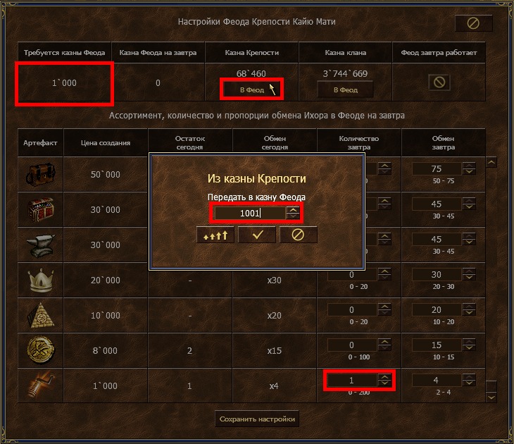 Теперь, чтобы в крепости эти предметы создались для обмена, нужно перенести из казны крепости или казны клана в казну феода необходимое количество золота +1 (это важно). Для этого нужно нажать на кнопку "В Феод" в соответствующем поле - либо "Казна Крепости", либо "Казна клана".