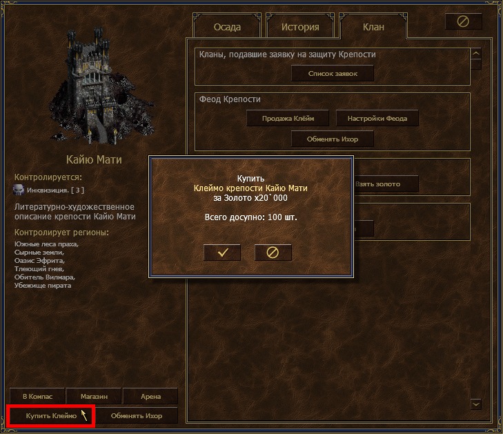 Если владелец крепости настроил вчера феод и выставил клейма на продажу, то сегодня любой игрок может купить клеймо этой крепости по выставленной цене (если клейма ещё остались в продаже). Игрок не может иметь больше одного клейма какой-то конкретной крепости одновременно, следующее можно будет купить только после того, как закончится предыдущее, но можно иметь сколько угодно клейм разных крепостей. Приобретя клеймо, игрок получает возможность клеймить монстров на территориях, подконтрольных крепости, в которой это клеймо приобретено. Использовать это клеймо в регионах других крепостей и в местах, где клеймить вообще нельзя, не выйдет. Узнать, какие территориии подконтрольны крепости, можно зайдя в крепость и посмотрев на список "Контролирует регионы:"