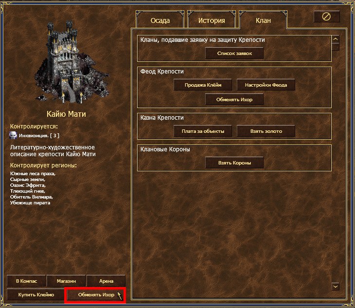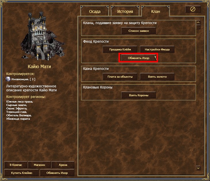 Весь ихор, за который покупают предметы в крепости, идёт в хранилище этой крепости. Владелец крепости может потратить этот ихор на более редкие предметы предметы. Для этого нужно зайти в крепость и на вкладке "Клан" в разделе "Феод крепости" нажать "Обменять Ихор." Стоит помнить, что здесь обменивается тот ихор, который в хранилище крепости, а не тот, который в инвентаре у героя, накопить ихор в хранилище можно только продавая предметы в феоде за ихор.