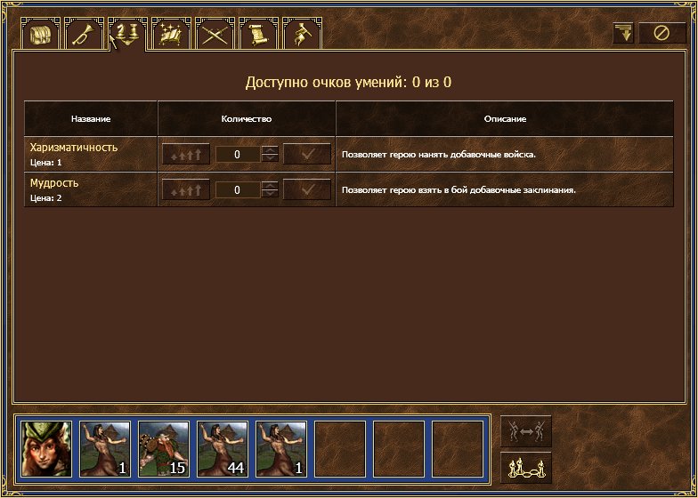 Третья вкладка – умения. Умения набираются на очки умений, которые так же, как и очки навыков, добавляются с ростом уровня героя. Существует 2 вида умений – харизматичность и мудрость. Увеличение харизматичности увеличивает харизму героя (800 харизмы за каждую единицу харизматичности) и дает возможность взять в битву больше войск – они с охотой следуют за харизматичным лидером. А мудрость увеличивает очки интеллекта (по 5 интеллекта за каждую единицу мудрости) и дает возможность взять в бой больше заклинаний – не так просто их все хорошенько запомнить.