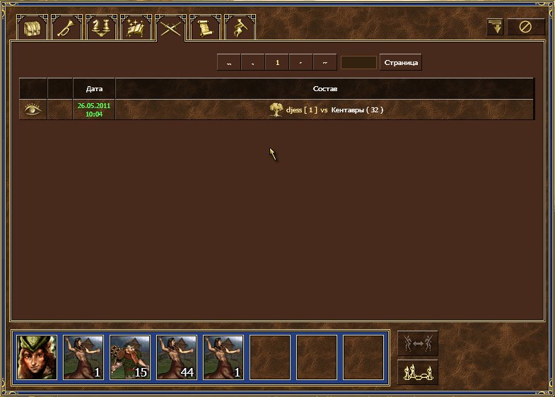 Пятая вкладка – бои. Это история боев, в которых участвовал герой. Пока она пустая, но ничего, скоро туда будет вписано много славных побед. Бои, в которых герою выпал артефакт – выделены зеленым цветом. Остальные бои записаны без выделения.