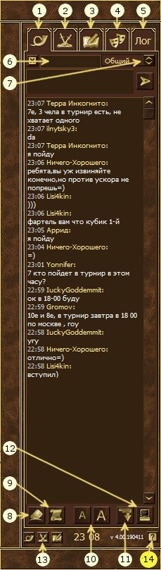 1 – вкладка чата. Общение игроков в игре происходит через чат. При нажатии на кнопку 7 можно указать тип чата – общий, торговый, клан-чат. Они служат разным целям и отображаются разными цветами для более удобной идентификации. Также существует приватное общение – для этого в строку 6 необходимо вставить имя того героя, которому вы хотите что-то написать.